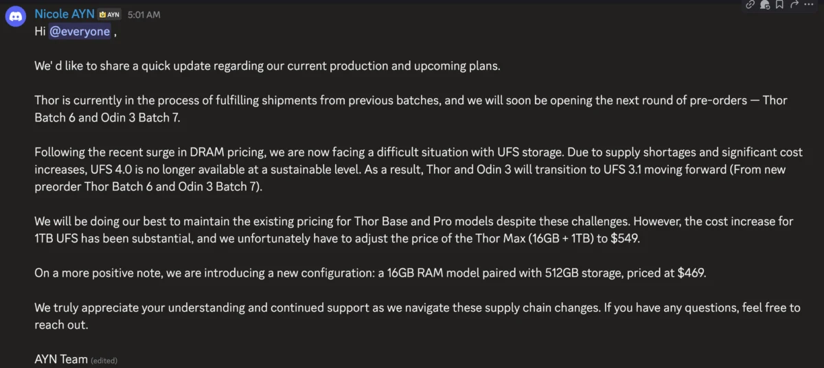 - April 2026 (as per article update): AYN formally announces the price increase for the Thor Max (16GB/1TB) and the planned transition of other Thor and Odin models to UFS 3.1 storage, citing unsustainable UFS 4.0 availability and cost. This update suggests a continuous evolution of the supply chain challenges and AYN’s strategic responses.
